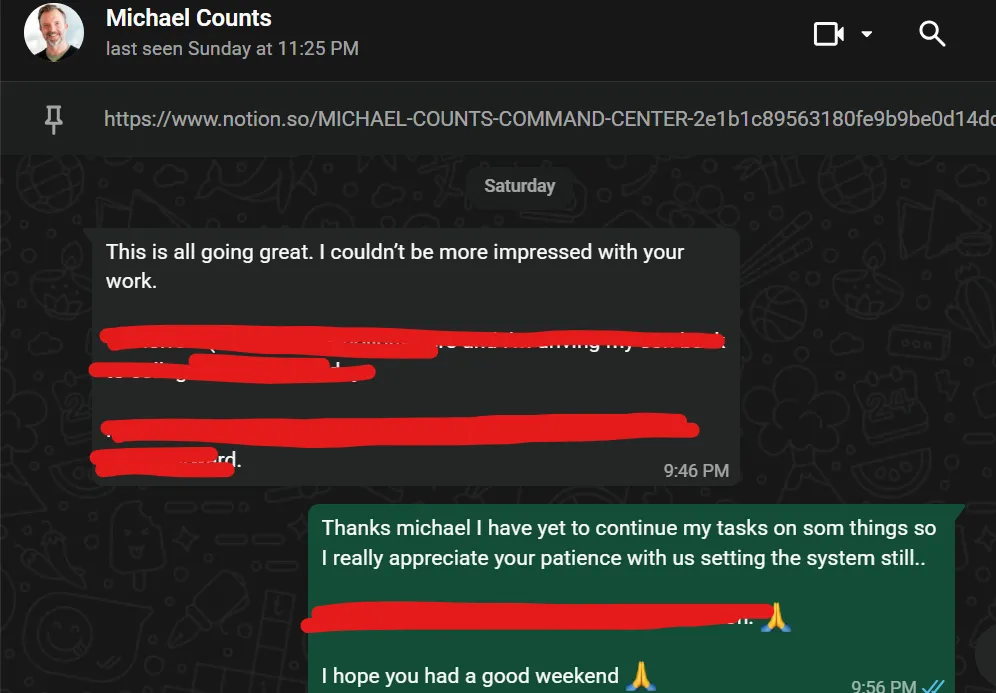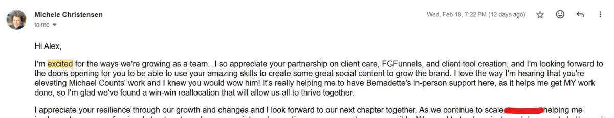 "I’m excited for the ways we’re growing as a team. I so appreciate your partnership on client care, FGFunnels, and client tool creation, and I’m looking forward to the doors opening for you to be able to use your amazing skills to create some great social content to grow the brand. I love the way I'm hearing that you're elevating Michael Counts' work and I knew you would wow him! It's really helping me to have Bernadette's in-person support here, as it helps me get MY work done, so I'm glad we've found a win-win reallocation that will allow us all to thrive together...."